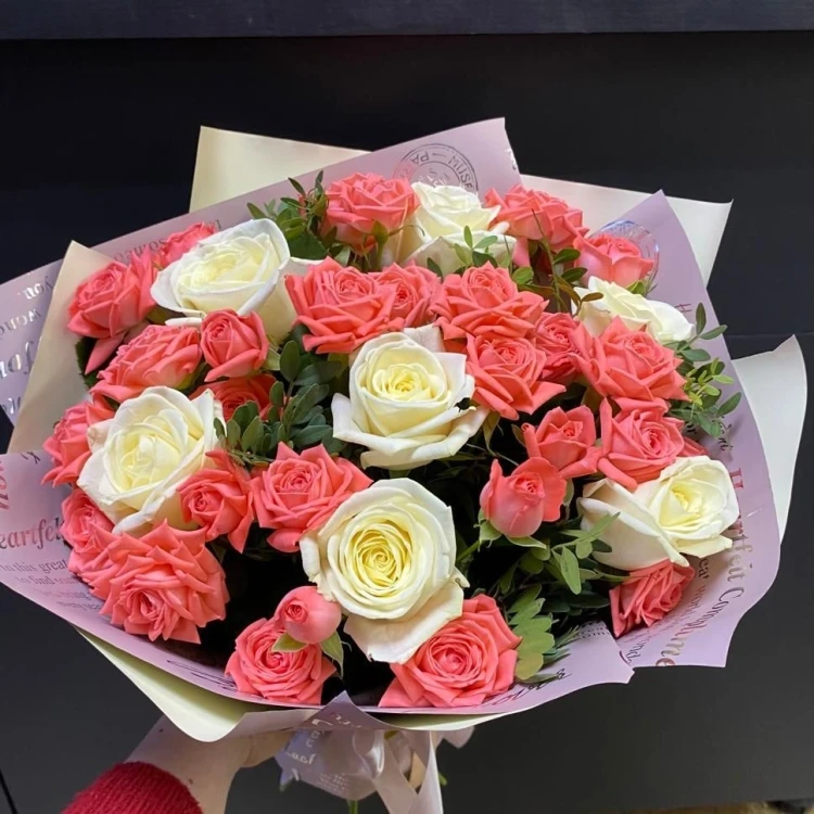 Этот букет изящных белых одноголовых и розовых кустовых роз гармонично сочетается с зеленью, что придает ему еще больше свежести. Белые розы символизируют чистоту и невинность, тогда как розовые розы выражают нежность и любовь. Такой букет подарит радость и поддержку, даже в самый пасмурный день, и идеально подойдет для выражения своих чувств или просто чтобы подарить красоту.